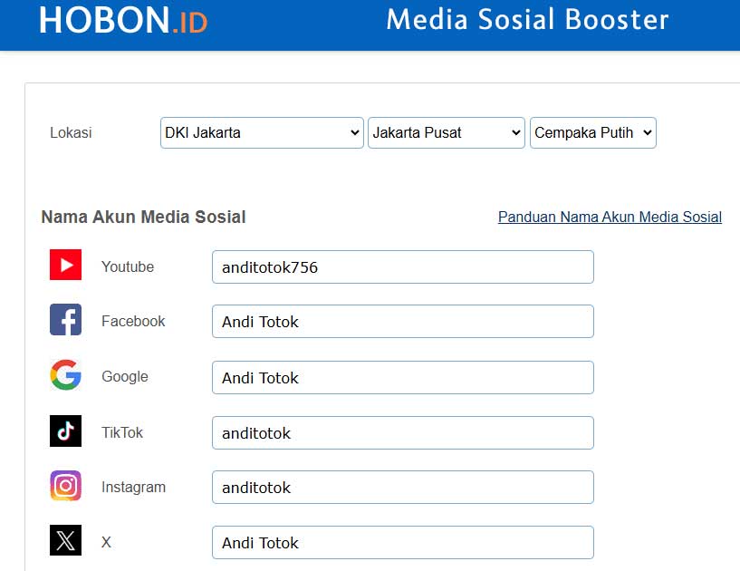 | Kemudian pada formulir pendaftaran, isikan lokasi Anda serta informasi nama akun media sosial Anda lalu klik tombol Kirim. | |